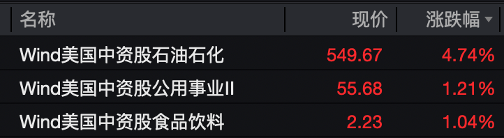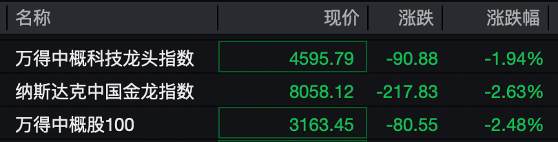 中概股普跌。纳斯达克中国金龙指数一度跌超3%,截至发稿跌幅为2.63%。不过,中资石油石化、公用事业、食品饮料等板块表现强势。