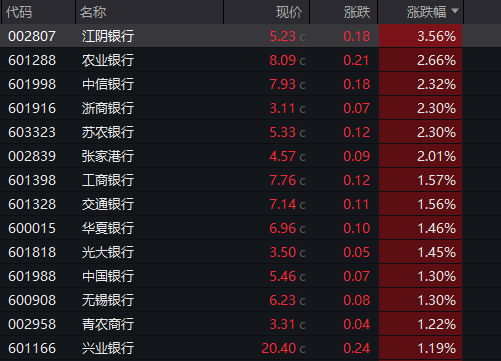 银行板块盘中发力拉升,截至收盘,江阴银行涨3.56%,农业银行涨2.66%,工商银行、交通银行、中国银行等均涨超1%。