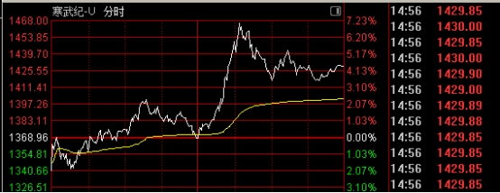 寒武纪(688256)午后大幅拉升,一度涨超7%,最高攀升至1468元/股,股价盘中再次超过贵州茅台。该股收盘涨4.42%,全日成交198亿元,居A股成交额首位,最新市值6028亿元。