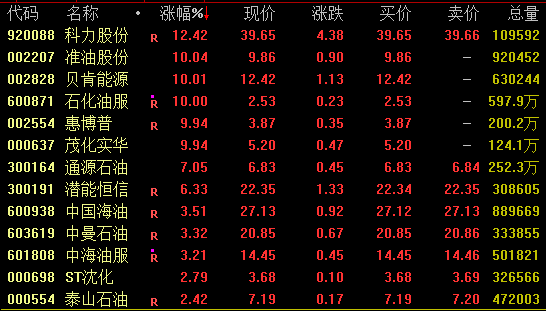 石油板块盘中发力走高,截至收盘,科力股份涨超12%,准油股份、贝肯能源、石化油服、惠博普、茂化实华等均涨停,潜能恒信涨超6%。