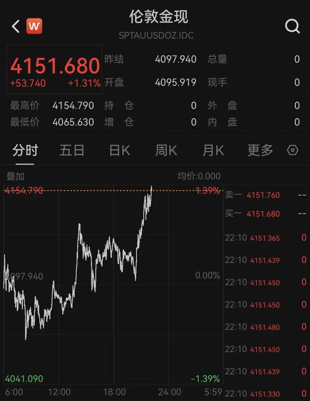 值得注意的是,今晚,国际金价突然直线大涨,截至发稿,伦敦金一度冲破4150美元。