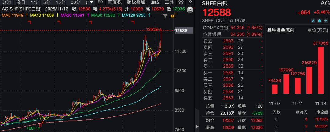 11月13日,国内白银期货强劲上涨,主力合约价格盘中最高一度达到12639元/千克,创出历史新高;截至收盘,报12588元/千克。国际白银现货价格也持续拉涨,最新报54.333美元/盎司,距离历史高点仅差一步之遥,日内涨幅超过2%。