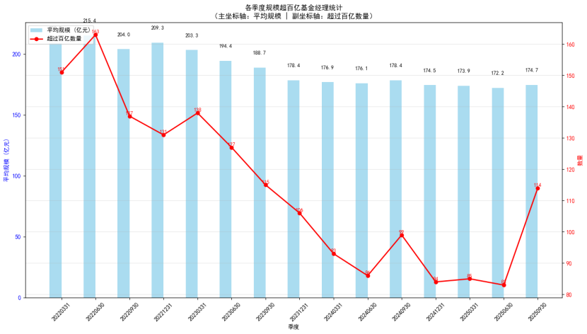 天相投顾对券商中国记者提供的统计数据显示,百亿基金经理人数在2022年一季度是151位,于当年二季度升到163位高点,平均管理规模超过200亿元。从2022年三季度开始,这一人数开始走低,到2023年末为106人。2024年一季度,百亿基金经理人数跌破100,到2025年二季度末时只有82人。从今年三季度开始,该人数时隔一年半之后重新回到100之上,截至目前约114名,平均管理规模174.7亿元。