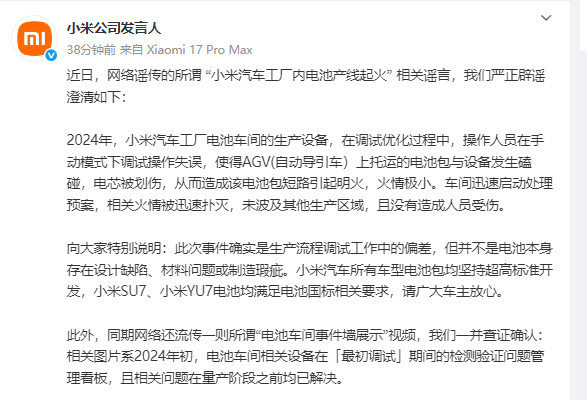 小米公司发言人称,向大家特别说明:此次事件确实是生产流程调试工作中的偏差,但并不是电池本身存在设计缺陷、材料问题或制造瑕疵。小米汽车所有车型电池包均坚持超高标准开发,小米SU7、小米YU7电池均满足电池国标相关要求,请广大车主放心。