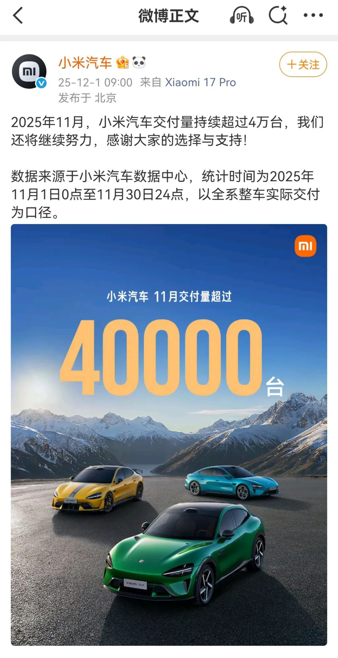 据小米汽车官微,2025年11月,小米汽车交付量持续超过4万台。数据来源于小米汽车数据中心,统计时间为2025年11月1日0点至11月30日24点,以全系整车实际交付为口径。