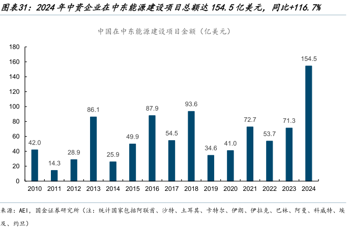 ①天然气EPC工程类型包括开采端、处理场站、增压场站、储气站等。根据MEEDProject,2024年中东&北非石油天然气、化工项目合同达1012亿美元,相对22年提升112%,中资企业24年在中东能源项目承包金额同比+116.7%。