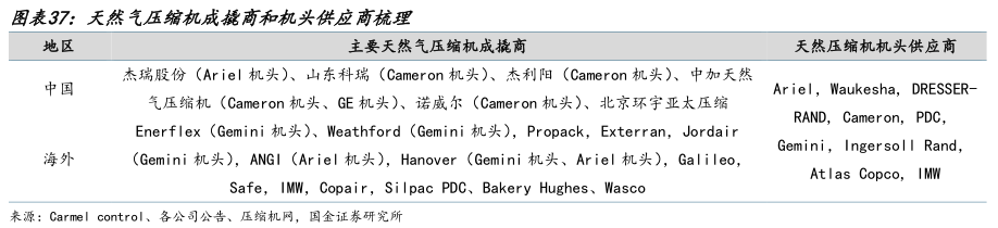 天然气压缩机头和成撬商为不同分工,海外头部成撬商有Enerflex(24年ES板块收入体量达12.4亿美元)等,国产厂商有杰瑞股份等。