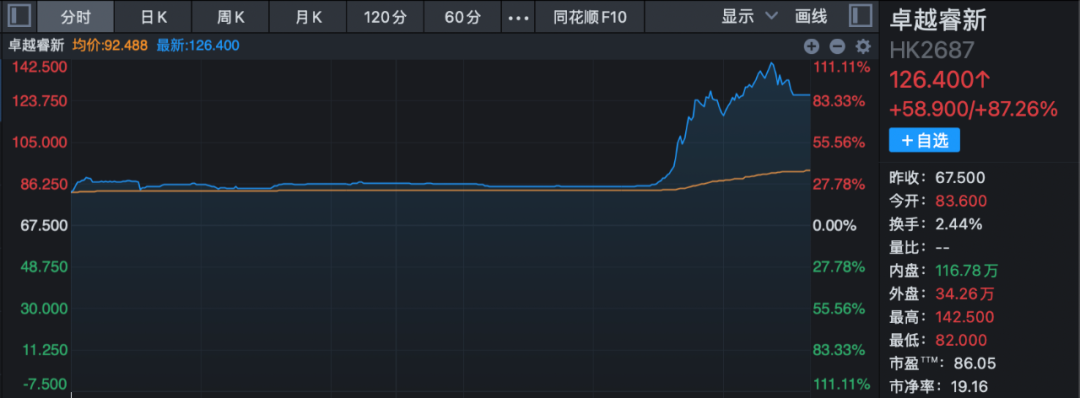 12月8日,卓越睿新正式登陆港交所。该股开盘即上涨23.9%报83.6港元/股,尾盘涨幅进一步扩大,最高触及142.5港元/股;最终收盘大涨87.26%,报126.40港元/股,为港股市场再添一只“红底股”。