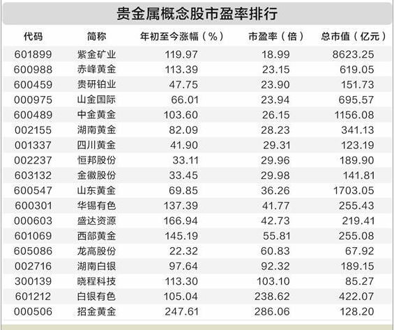 据证券时报·数据宝统计,A股中贵金属概念股共有18只,年初至今平均上涨97.03%,招金黄金、盛达资源、西部黄金等9股累计涨幅均超过100%。