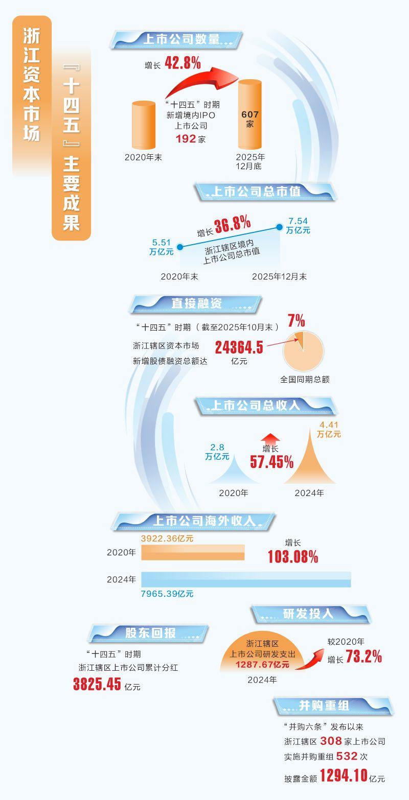 作为中国资本市场的重要增长极与组成部分,浙江资本市场上市公司群体庞大、新兴产业占比高,多元资本服务生态协同模式成熟,债券、REITs等金融工具创新成效显著。“十四五”时期的成果不仅筑牢了浙江特色现代化产业体系的资本根基,更为全国地方资本市场服务新质生产力、打通“资本—实体”循环提供了示范性经验。展望“十五五”,浙江将进一步精准有效发挥资本市场服务功能,为因地制宜大力发展新质生产力、加快构建浙江特色现代化产业体系提供强有力支撑。