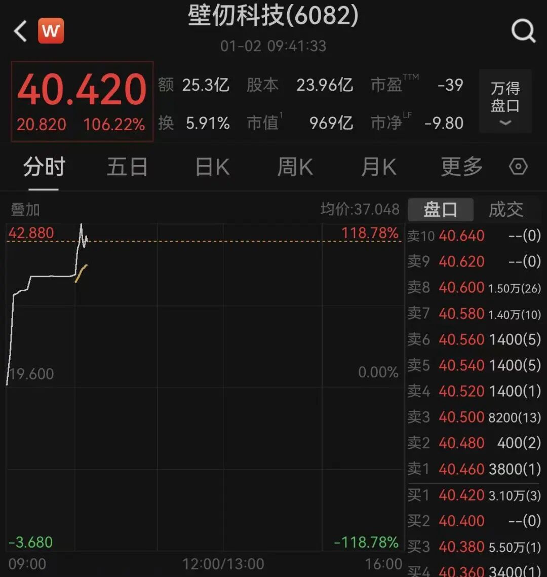 截至发稿,壁仞科技涨超100%,股价冲上40港元。