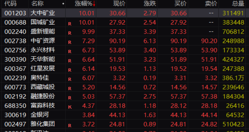 概念板块方面,锂矿概念板块大涨,板块盘中涨幅超过2%,大中矿业、围城矿业、盛新锂能等股票盘中涨停。消息面上,今天上午国内碳酸锂期货大涨,主力合约盘中涨幅超过6%。