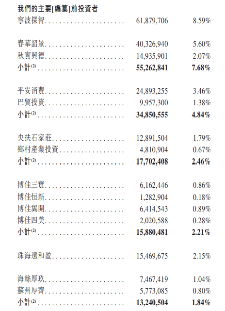 红杉中国通过宁波探智持股8.59%,为最大的外部机构股东;春华资本通过春华韶景和秋实兴德合计持股为7.68%;平安资本通过平安消费和巴贸投资合计持股4.84%;河北建投创发基金通过央扶石家庄和乡村产业投资合计持股2.46%;茅台通过其私募基金茅台金石合持股0.94%。