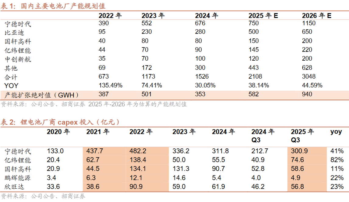 过去几年,全球锂电池需求持续超预期,2025年由于头部企业产能不足,开始出现订单外溢,25年下半年二三线厂商也连续开始供不应求。