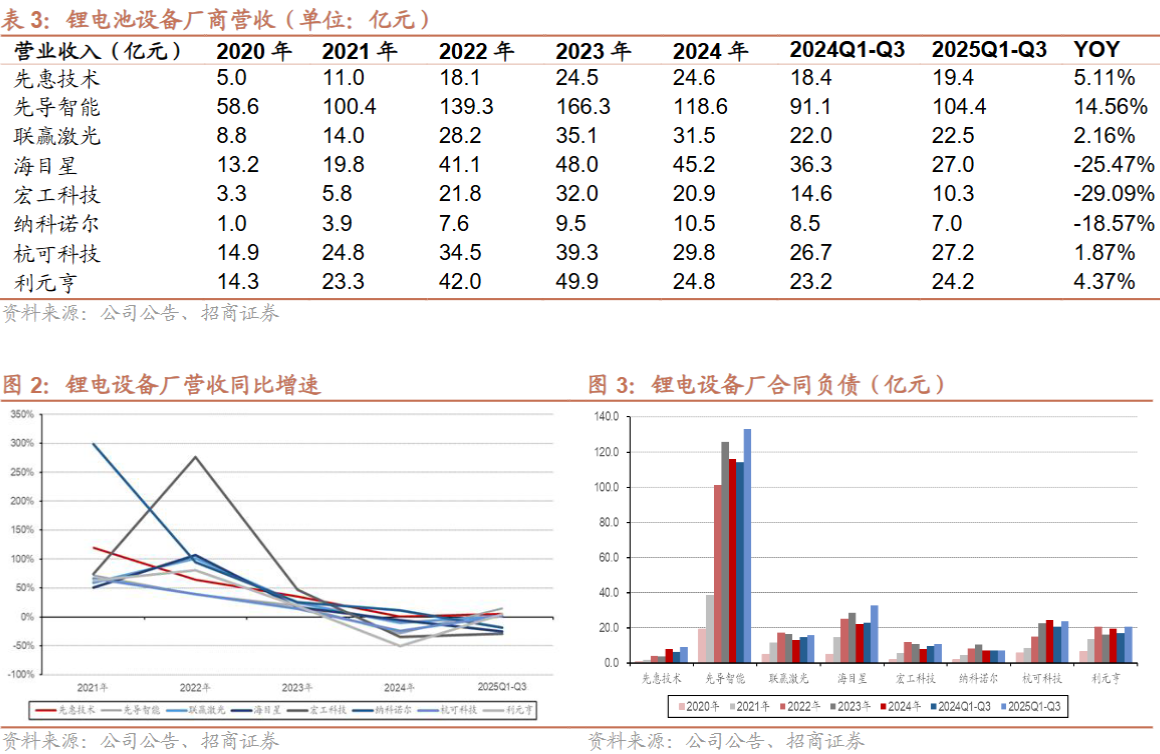 锂电设备多为大型非标定制化产品,从设计、生产、安装调试到最终验收,订单完成需要较长时间。合同负债可以作为公司未来业绩增速的前瞻指标,在2025年Q1-Q3大部分设备厂商合同负债同比增速开始转正,且大部分均突破历史峰值。
