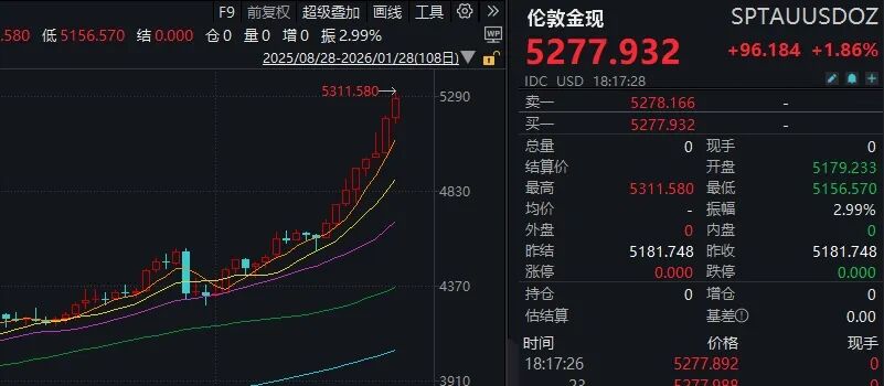 近日国际金价狂飙,1月28日现货黄金一度突破5300美元/盎司。