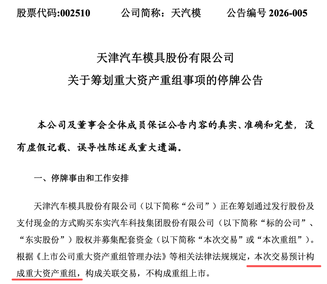 公告显示,天汽模正在筹划通过发行股份及支付现金的方式购买东实汽车科技集团股份有限公司(简称“东实股份”)股权并募集配套资金。公司预计在不超过10个交易日内(即在3月2日前)披露本次交易方案,并申请复牌。