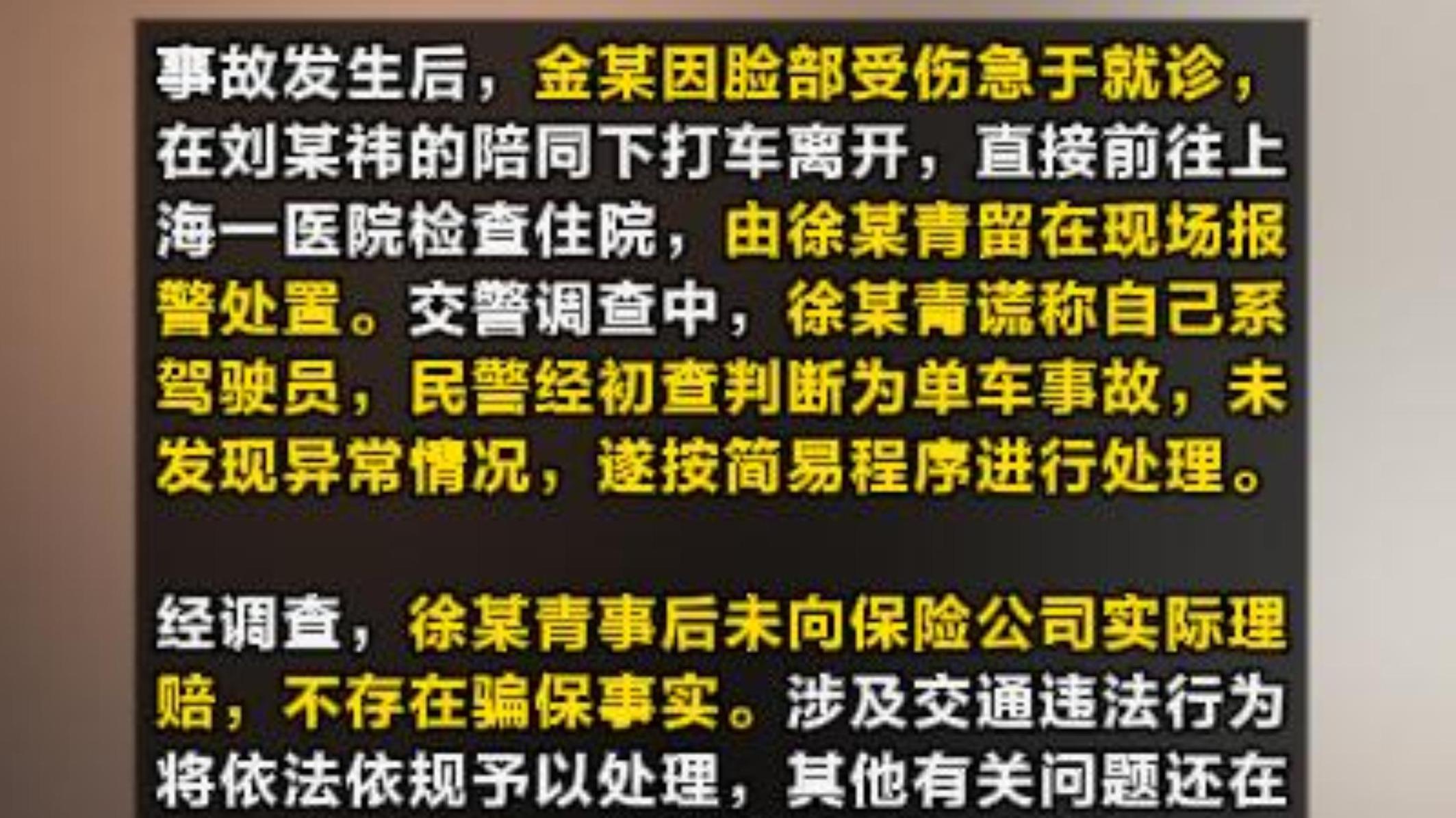 警方通报“金晨被曝肇事逃逸”,金某因脸部受伤急于就诊,由徐某青留在现场报警处置,不存在骗保事实